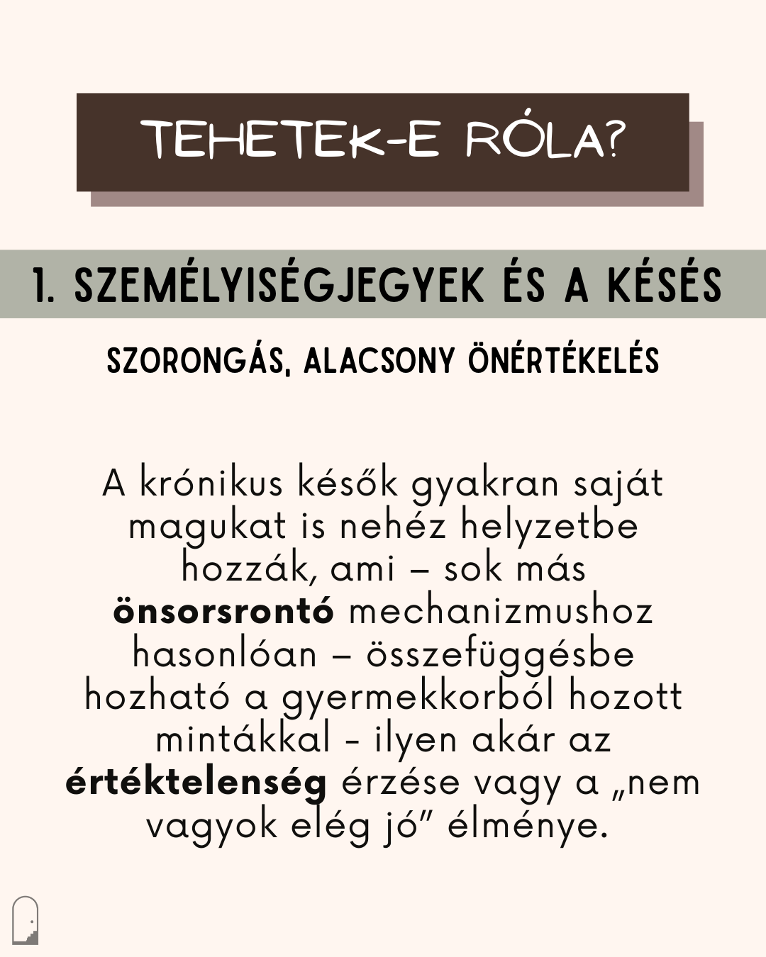 A krónikus késők gyakran saját magukat is nehéz helyzetbe hozzák, ami – sok más önsorsrontó mechanizmushoz hasonlóan – összefüggésbe hozható a gyermekkorból hozott mintákkal – ilyen akár az értéktelenség érzése vagy a „nem vagyok elég jó” élménye.