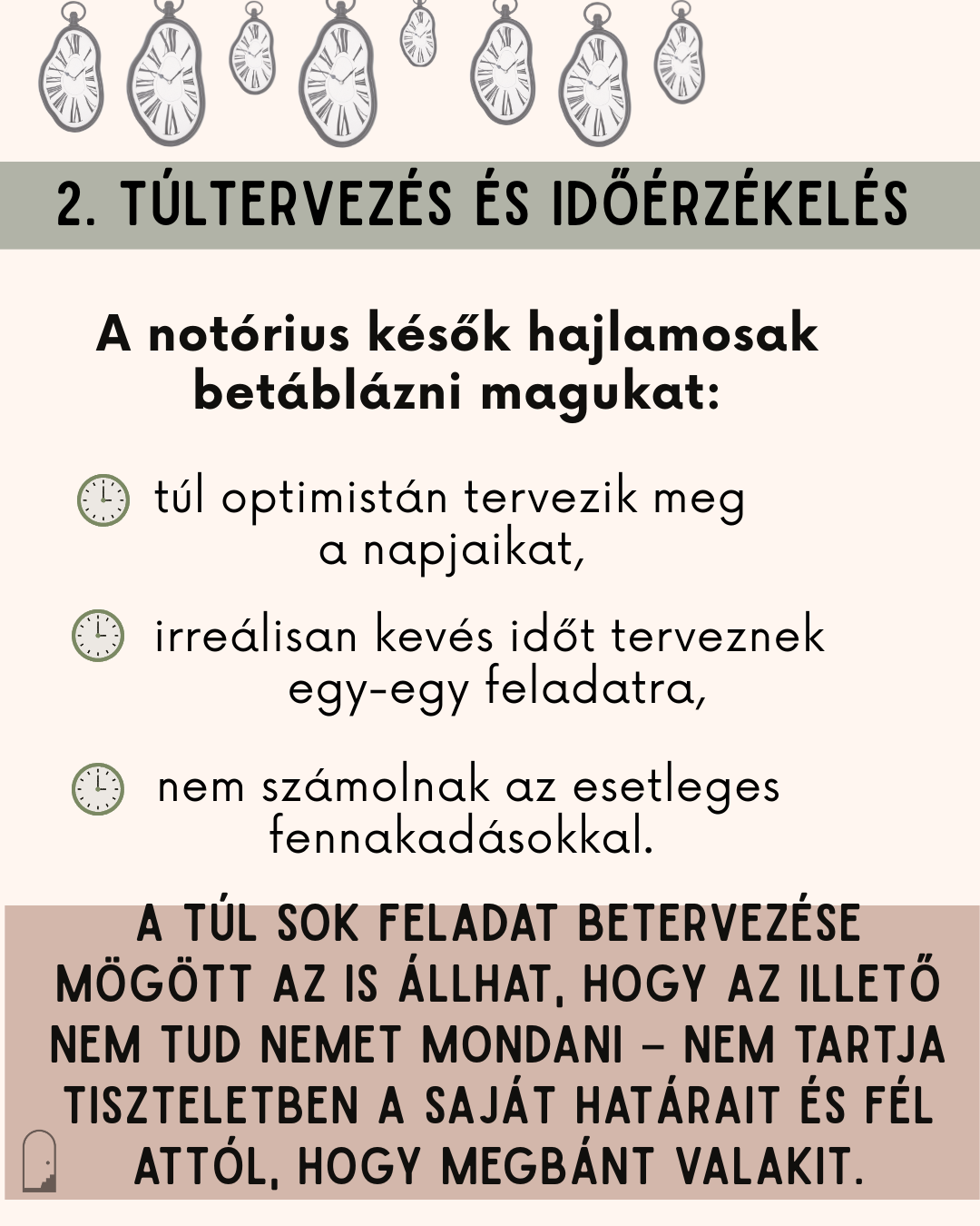 A notórius késők hajlamosak betáblázni magukat: túl optimistán tervezik meg a napjaikat, irreálisan kevés időt terveznek egy-egy feladatra, nem számolnak az esetleges fennakadásokkal.