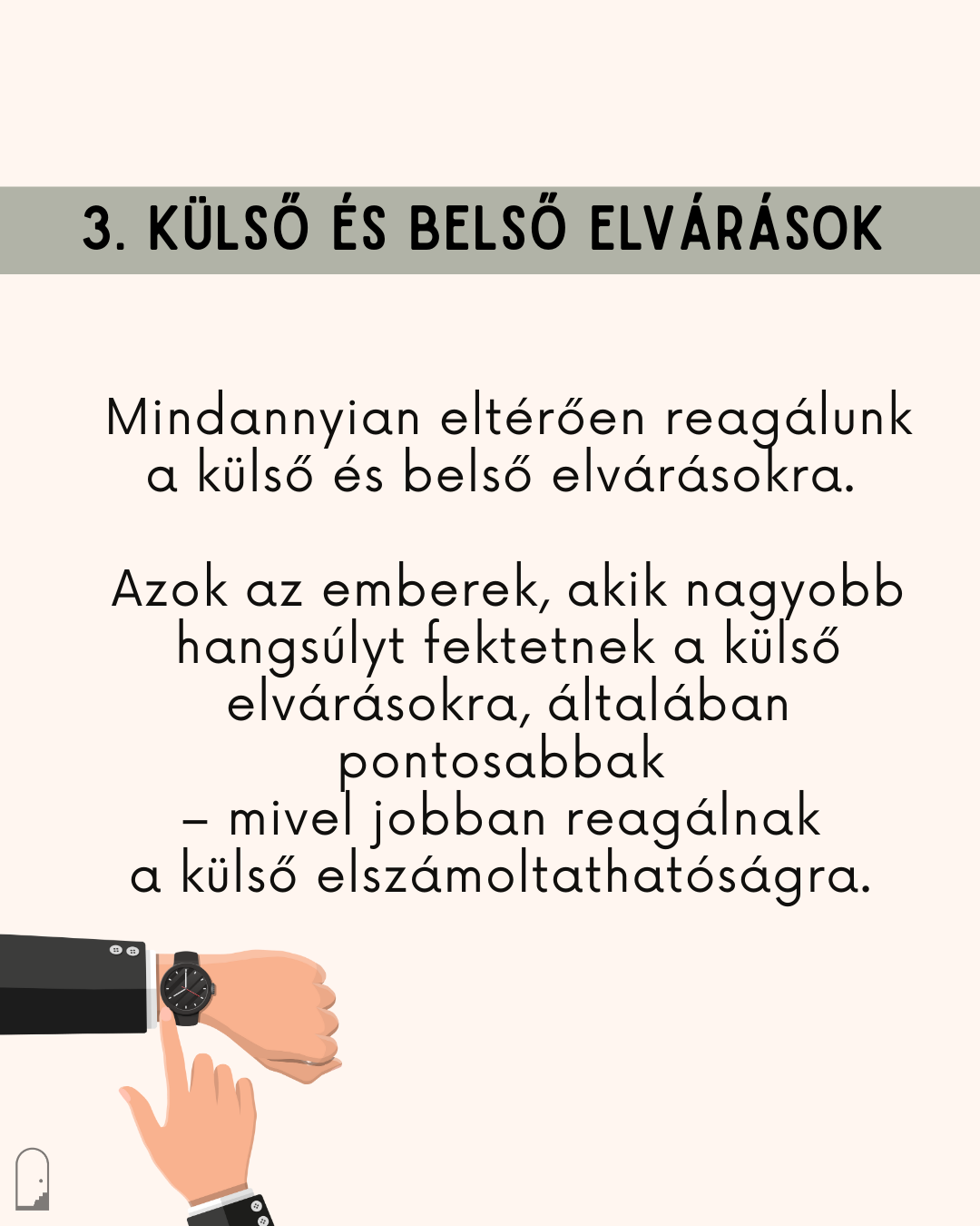 Mindannyian eltérően reagálunk a külső és belső elvárásokra. Azok az emberek, akik nagyobb hangsúlyt fektetnek a külső elvárásokra, általában pontosabbak – mivel jobban reagálnak a külső elszámoltathatóságra.