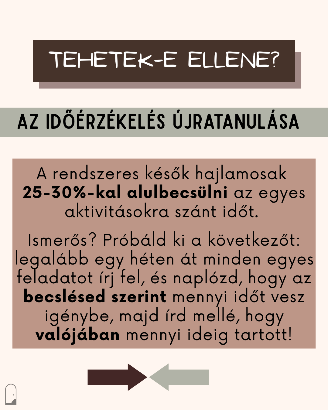 A rendszeres késők hajlamosak, 25-30%-kal alulbecsülni az egyes aktivitásokra szánt időt. Ismerős? Próbáld ki a következőt: legalább egy héten át minden egyes feladatot írj fel, és naplózd, hogy az becslésed szerint mennyi időt vesz igénybe, majd írd mellé, hogy valójában mennyi ideig tartott!