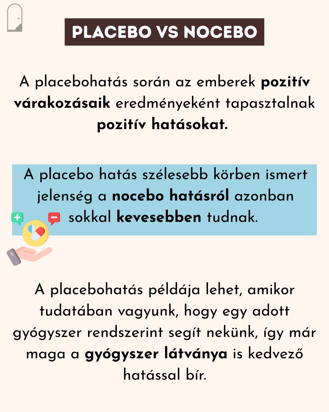 A placebohatás során az emberek pozitív várakozásaik eredményeként tapasztalnak pozitív hatásokat. A placebo hatás szélesebb körben ismert jelenség a nocebo hatásról azonban sokkal kevesebben tudnak. A placebohatás példája lehet, amikor tudatában vagyunk, hogy egy adott gyógyszer rendszerint segít nekünk, így már maga a gyógyszer látványa is kedvező hatással bír.