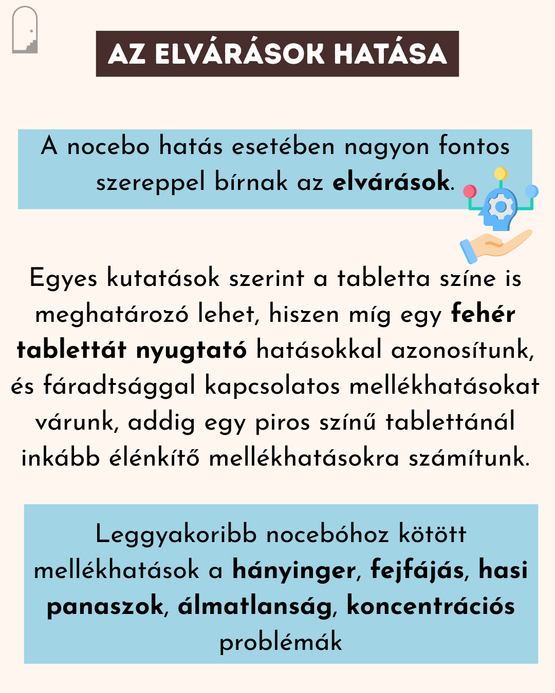A nocebo hatás esetében nagyon fontos szereppel bírnak az elvárások. A tabletta színe is meghatározó lehet, hiszen míg egy fehér tablettát nyugtató hatásokkal azonosítunk, és fáradtsággal kapcsolatos mellékhatásokat várunk, addig egy piros színű tablettánál inkább aktiváló mellékhatásokra számítunk. A leggyakoribb ilyen mellékhatások a hányinger, fejfájás, hasi panaszok, álmatlanság, koncentrációs problémák.