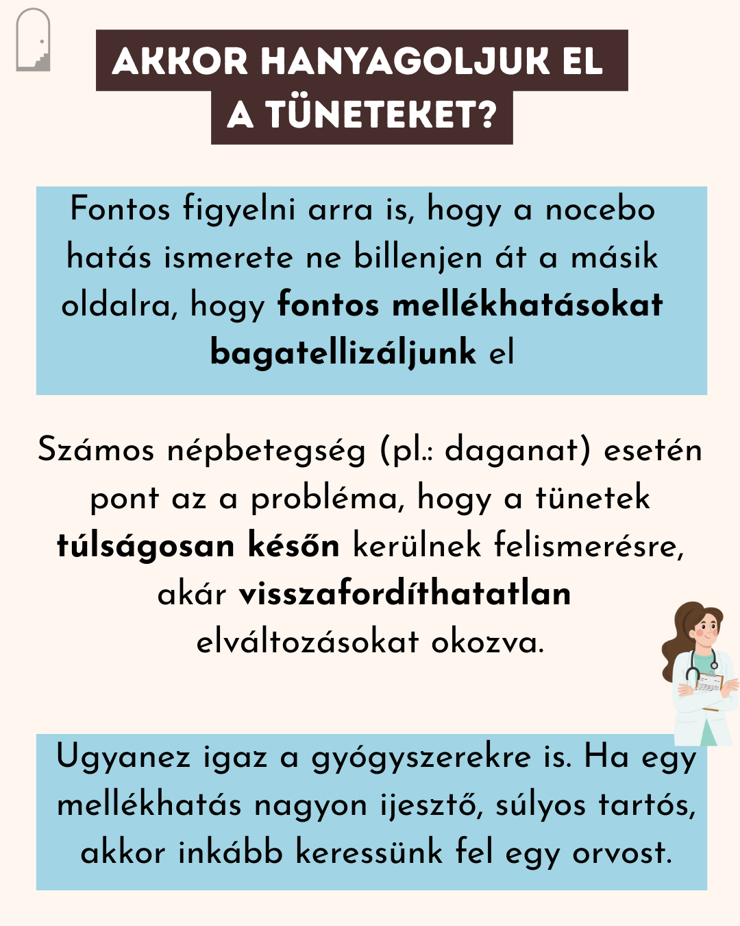 Fontos figyelni arra is, hogy a nocebo hatás ismerete ne billenjen át a másik oldalra, hogy fontos mellékhatásokat bagatellizáljunk el. Számos népbetegség (pl.: daganat) esetén pont az a probléma, hogy a tünetek túlságosan későn kerülnek felismerésre, akár visszafordíthatatlan elváltozásokat okozva. Ugyanez igaz a gyógyszerekre is. Ha egy mellékhatás nagyon ijesztő, súlyos tartós, akkor inkább keressünk fel egy orvost.