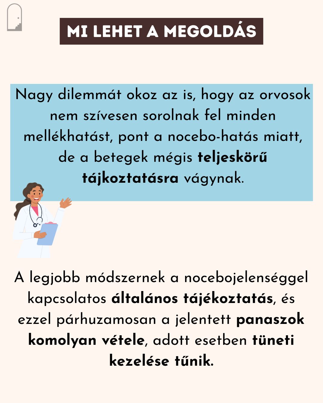 Nagy dilemmát okoz az is, hogy az orvosok nem szívesen sorolnak fel minden mellékhatást, pont a nocebo-hatás miatt, de a betegek mégis teljeskörű tájkoztatásra vágnyak. A legjobb módszernek a nocebojelenséggel kapcsolatos általános tájékoztatás, és ezzel párhuzamosan a jelentett panaszok komolyan vétele, adott esetben tüneti kezelése tűnik