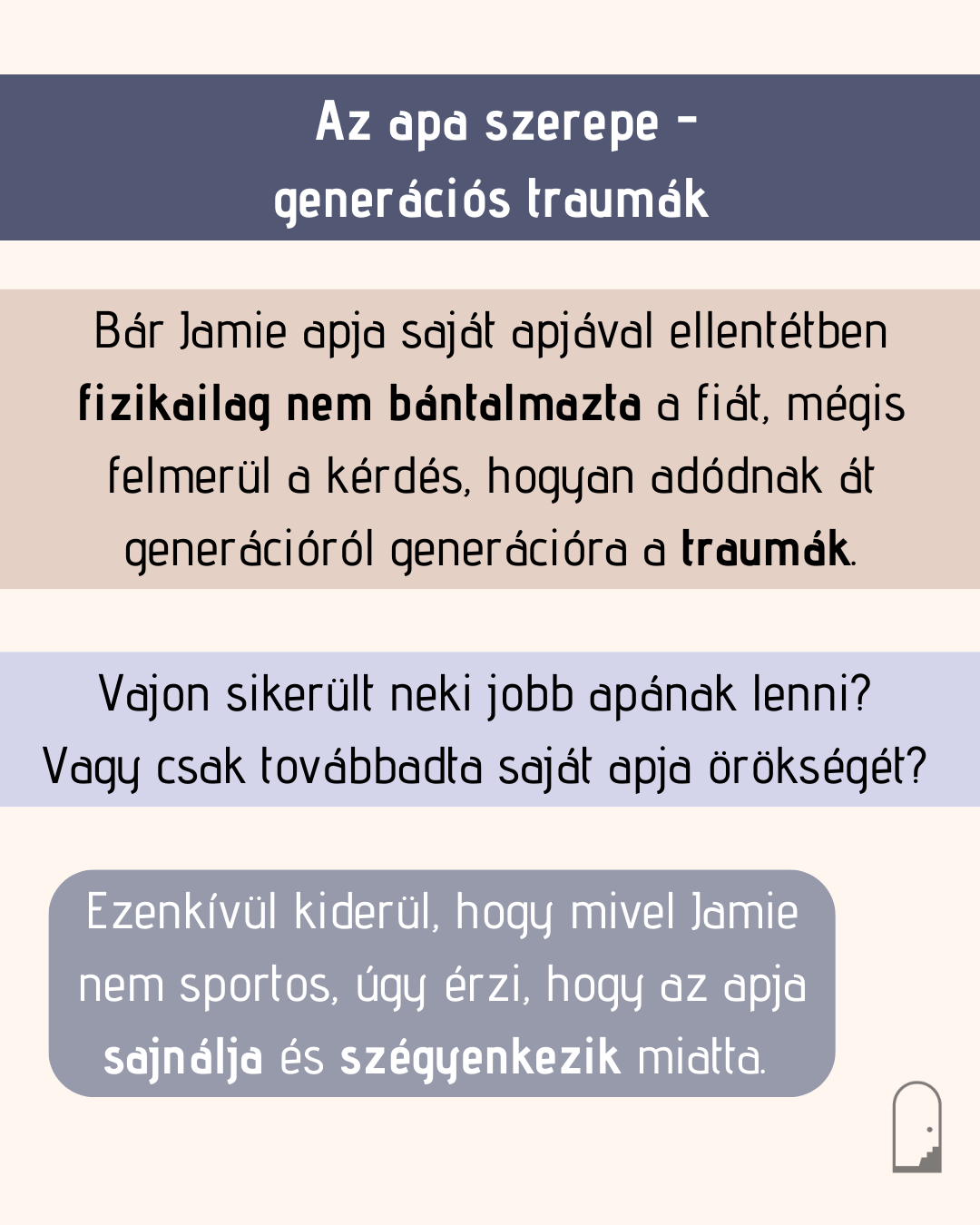 Bár Jamie apja saját apjával ellentétben fizikailag nem bántalmazta a fiát, mégis felmerül a kérdés, hogyan adódnak át generációról generációra a traumák. Vajon sikerült neki jobb apának lenni? Vagy csak továbbadta saját apja örökségét? Ezenkívül kiderül, hogy mivel Jamie nem sportos, úgy érzi, hogy az apja sajnálja és szégyenkezik miatta.