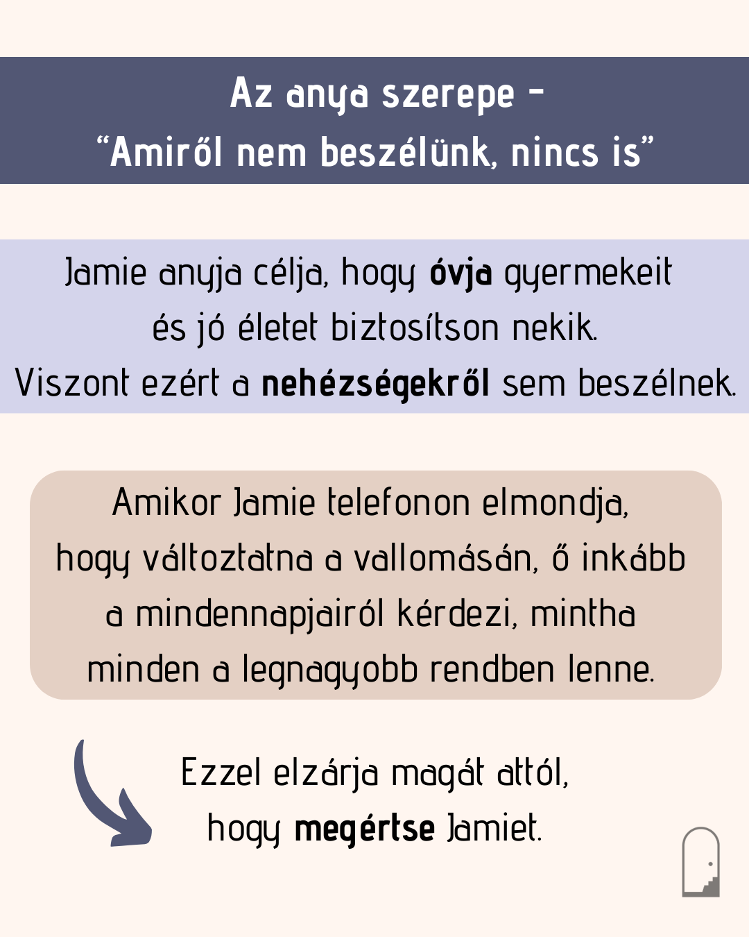 Jamie anyja célja, hogy óvja gyermekeit és jó életet biztosítson nekik. Viszont ezért a nehézségekről sem beszélnek. Amikor Jamie telefonon elmondja, hogy változtatna a vallomásán, ő inkább a mindennapjairól kérdezi, mintha minden a legnagyobb rendben lenne. Ezzel elzárja magát attól, hogy megértse Jamiet.