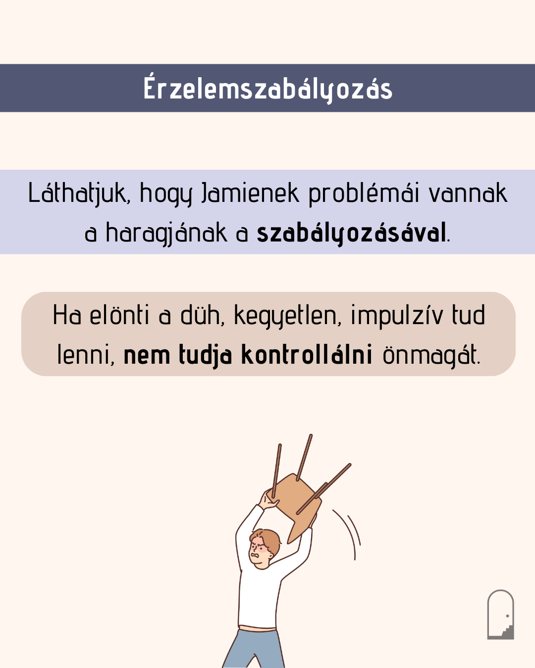 Láthatjuk, hogy Jamienek problémái vannak a haragjának a szabályozásával. Ha elönti a düh, kegyetlen, impulzív tud lenni, nem tudja kontrollálni önmagát.