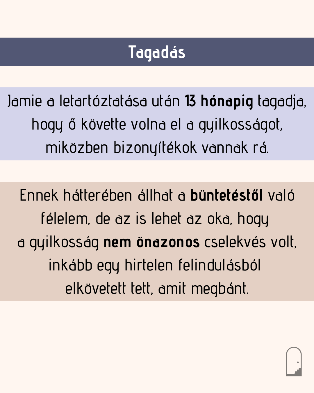 Jamie a letartóztatása után 13 hónapig tagadja, hogy ő követte volna el a gyilkosságot, miközben bizonyítékok vannak rá. Ennek hátterében állhat a büntetéstől való félelem, de az is lehet az oka, hogy a gyilkosság nem önazonos cselekvés volt, inkább egy hirtelen felindulásból elkövetett tett, amit megbánt.