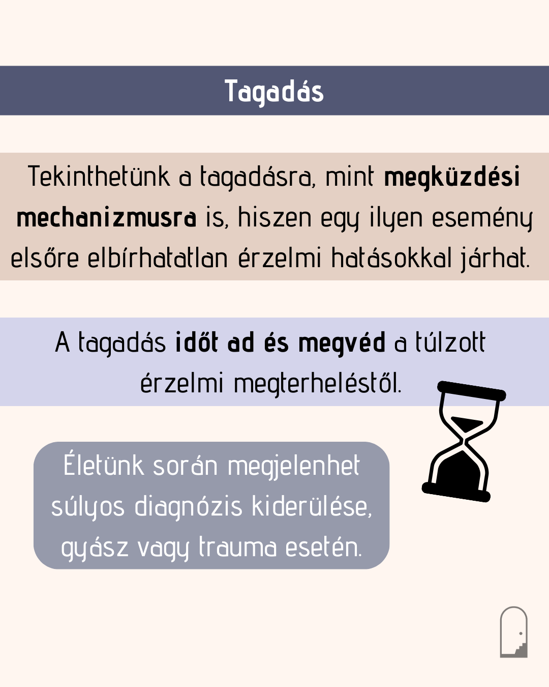 Tekinthetünk a tagadásra, mint megküzdési mechanizmusra is, hiszen egy ilyen esemény elsőre elbírhatatlan érzelmi hatásokkal járhat. A tagadás időt ad és megvéd a túlzott érzelmi megterheléstől. Életünk során megjelenhet súlyos diagnózis kiderülése, gyász vagy trauma esetén.