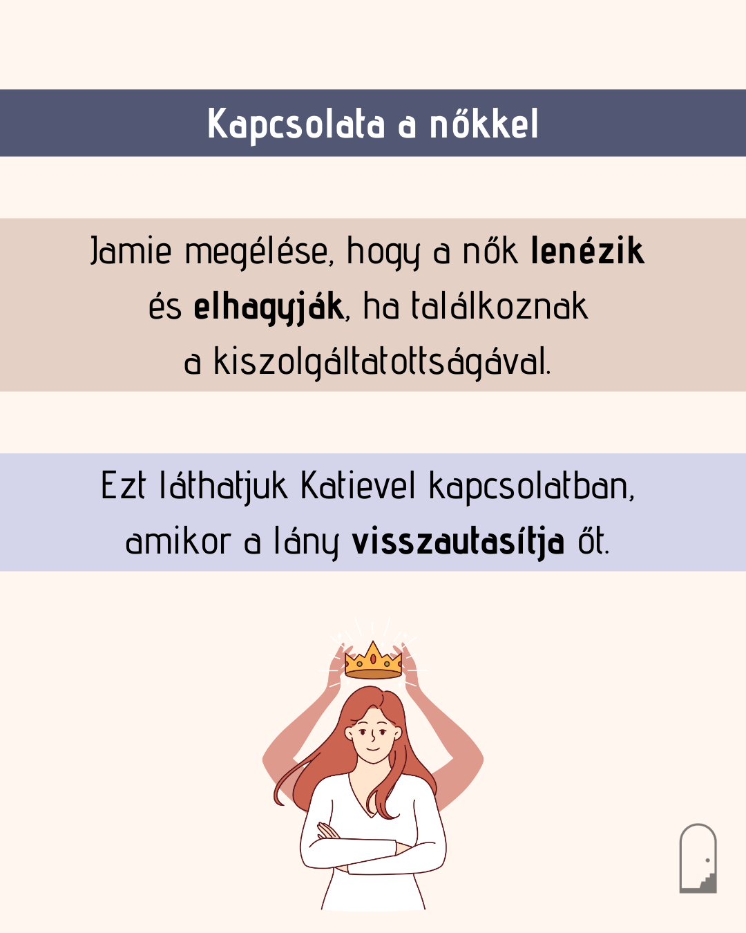 Jamie megélése, hogy a nők lenézik és elhagyják, ha találkoznak a kiszolgáltatottságával. Ezt láthatjuk Katievel kapcsolatban, amikor a lány visszautasítja őt.