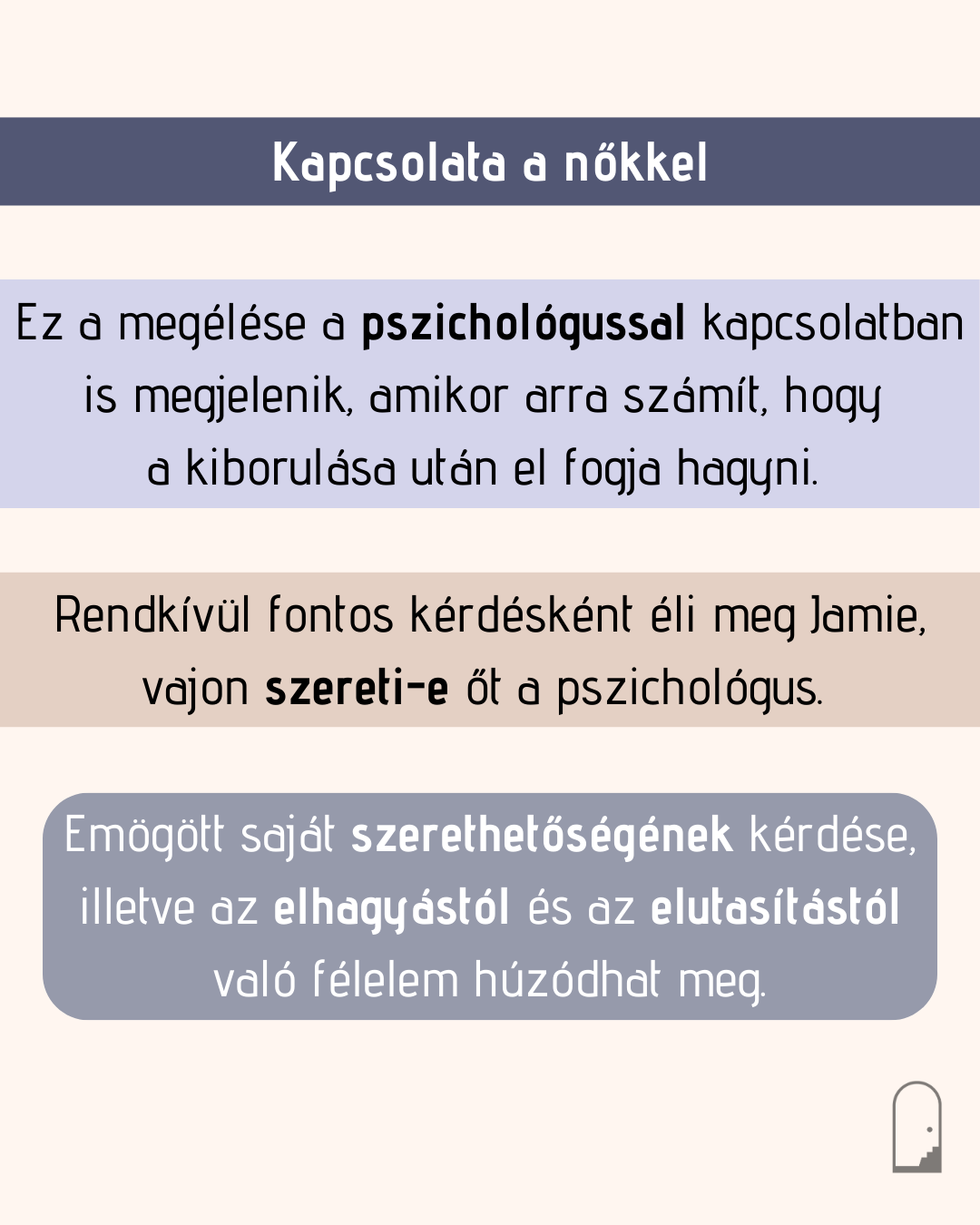 Ez a megélése a pszichológussal kapcsolatban is megjelenik, amikor arra számít, hogy a kiborulása után el fogja hagyni. Rendkívül fontos kérdésként éli meg Jamie, vajon szereti-e őt a pszichológus. Emögött saját szerethetőségének kérdése, illetve az elhagyástól és az elutasítástól való félelem húzódhat meg.